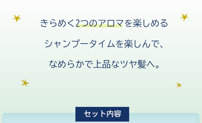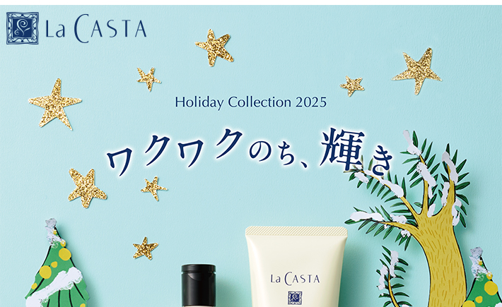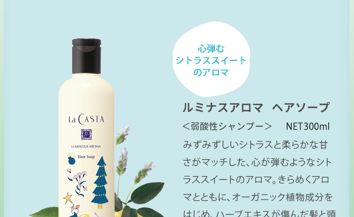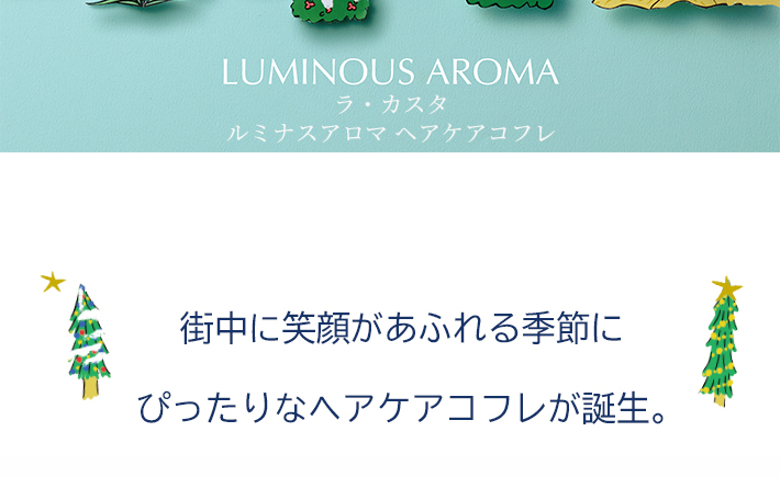 - わくわく心躍るシーズンにラ・カスタがお届けする特別なコフレ。心弾むアロマのヘアソープと、甘やかなアロマのヘアマスク、きらめく2つアロマが織りなす特別な時間を楽しみながら、美しく輝くツヤ髪へ。